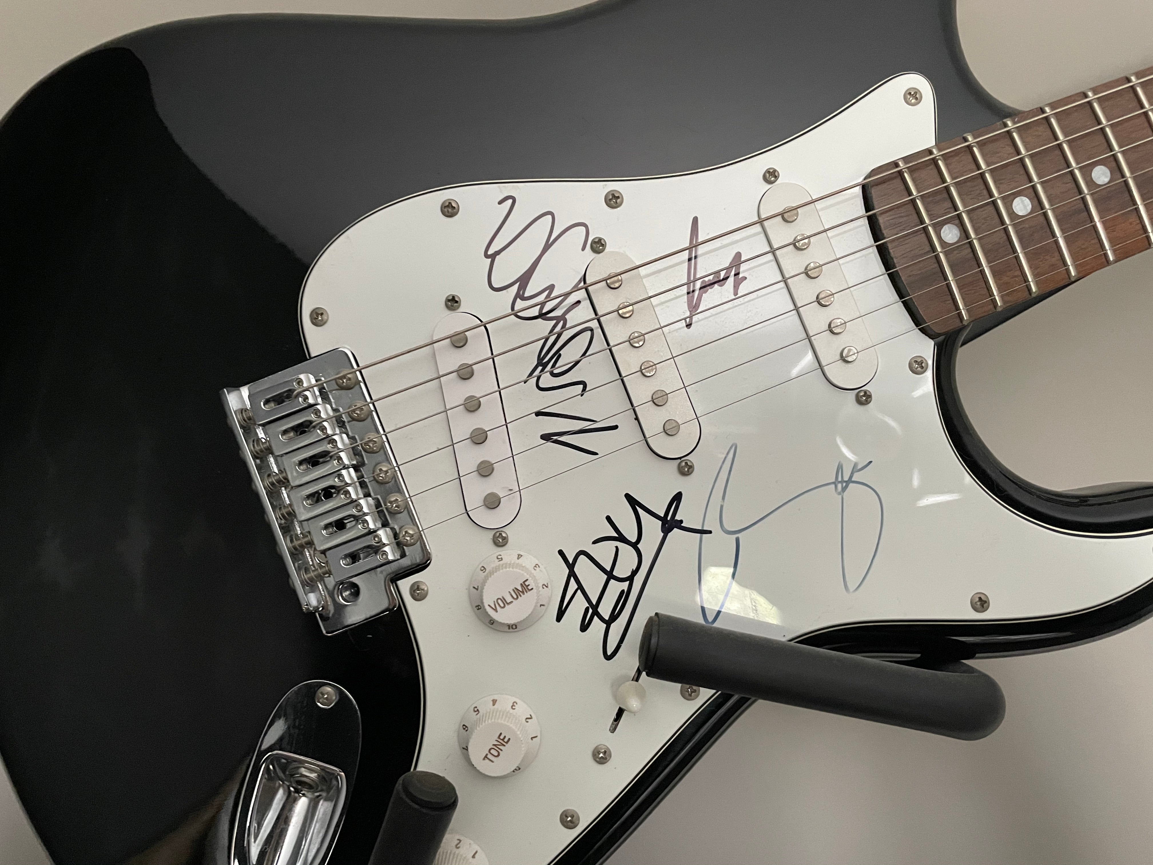 Autographed by all 4 members of U2; Bono (1960- ), The Edge (1961- ), Larry Mullen (1961- ) and Adam Clayton (1960- ) in bold black ink on the scratch plate.