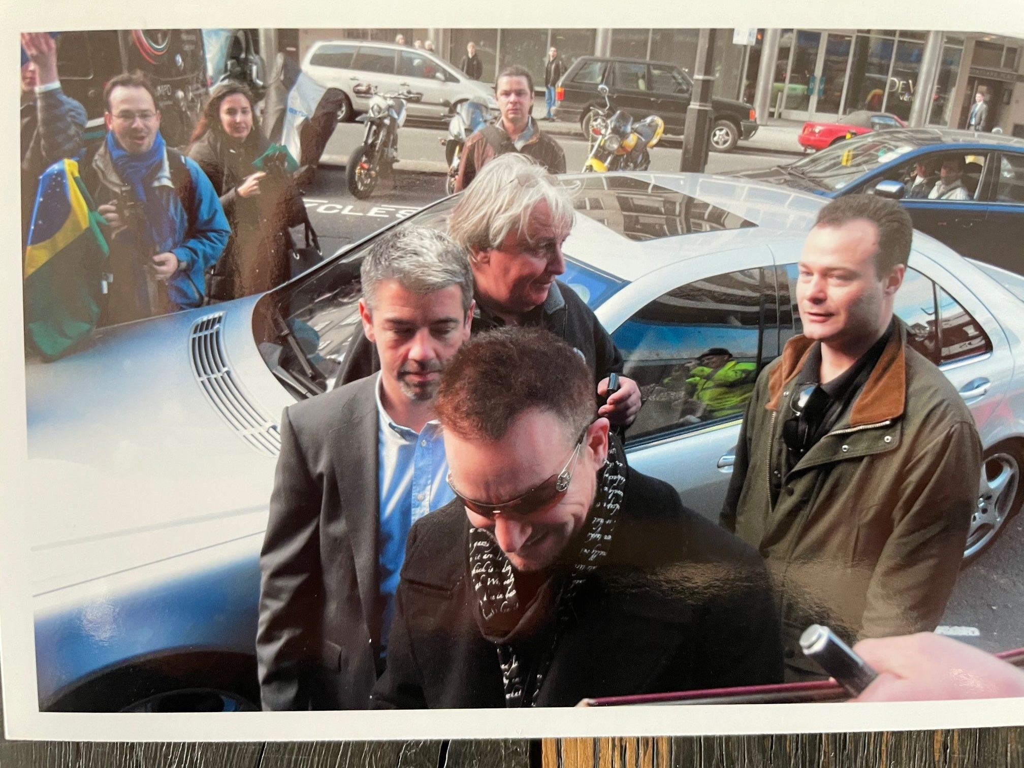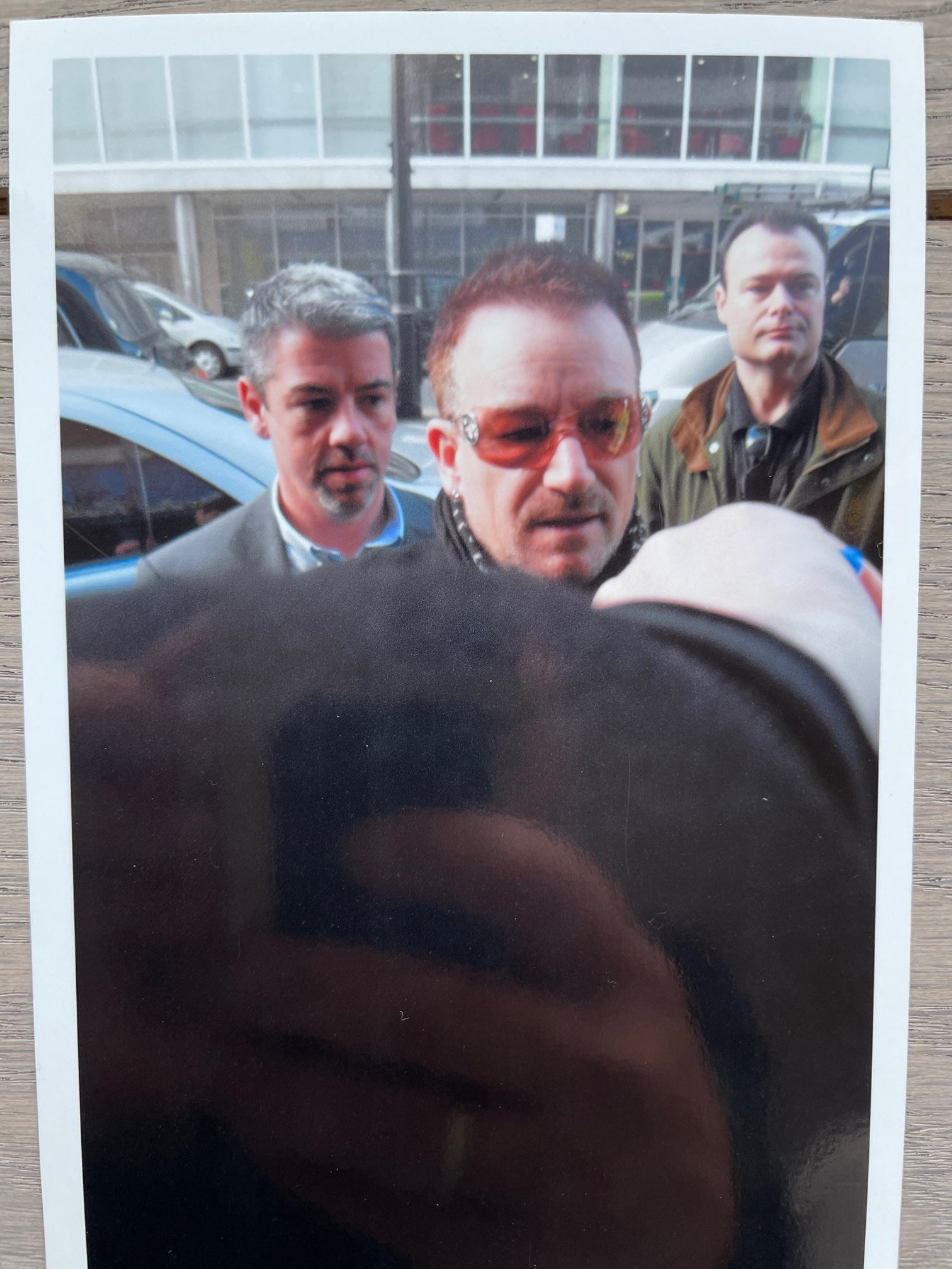 U2 autographed the guitar on February 27, 2009 outside BBC Broadcasting House in Portland Place, London. The band released their 12th album (No Line on the Horizon) that day, with a set on BBC Radio 1's Live Lounge and a rooftop concert.