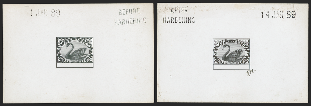 Western Australia 1889 (Jan) matched pair of die proofs in black on glazed cards (92x60mm) from the undenominated master die for the 1890-93 2½d to 1s values (x5), respectively '1 JAN 89, BEFORE HARDENING' and '14 JAN 89, AFTER HARDENING' with appropriate handstamps, the second with M/S initials 'GN', SG97/102.