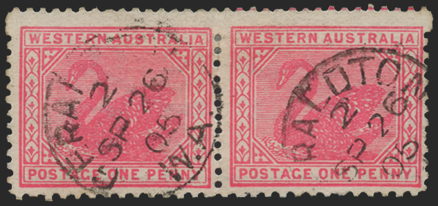 Western Australia 1902-11 1d carmine-rose, watermark V over crown sideways (type 33), horizontal pair, perforations compound of 12½x12 (comb) and 11 line (at foot), SG135.