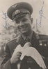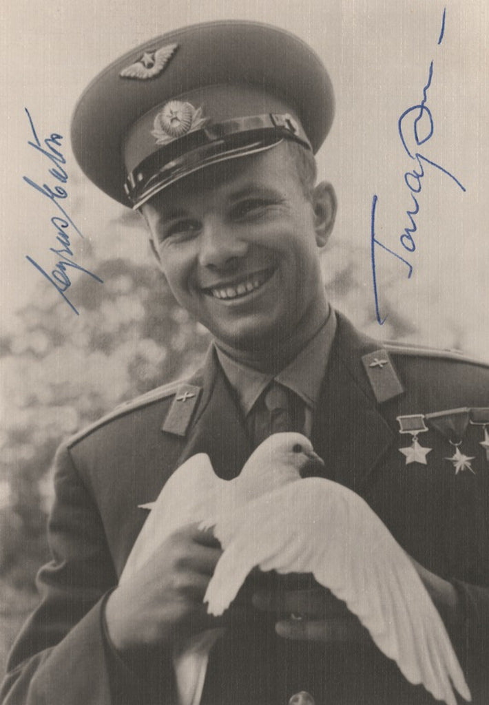 - A black and white photograph postcard signed by the pioneering Soviet cosmonaut Yuri Gagarin, the first human being in space.