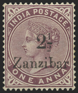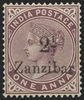 Zanzibar 1896 (11 May) 2½ on 1a plum, type 3 surcharge in black, small second "z" and "inverted" "q" for "b", SG23E.